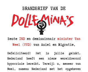 Onlangs stuurde Dolle Mina een woedende brandbrief naar de IND en demissionair minister Van Weel (VVD) van Asiel en Migratie. Terwijl Van Weel de Taliban in Afghanistan aanklaagt wegens schending van vrouwenrechten, laat hij tegelijkertijd gevluchte Afghaanse vrouwen deporteren naar dat moslimfundamentalistische regime. Hieronder de integrale tekst van de brief.