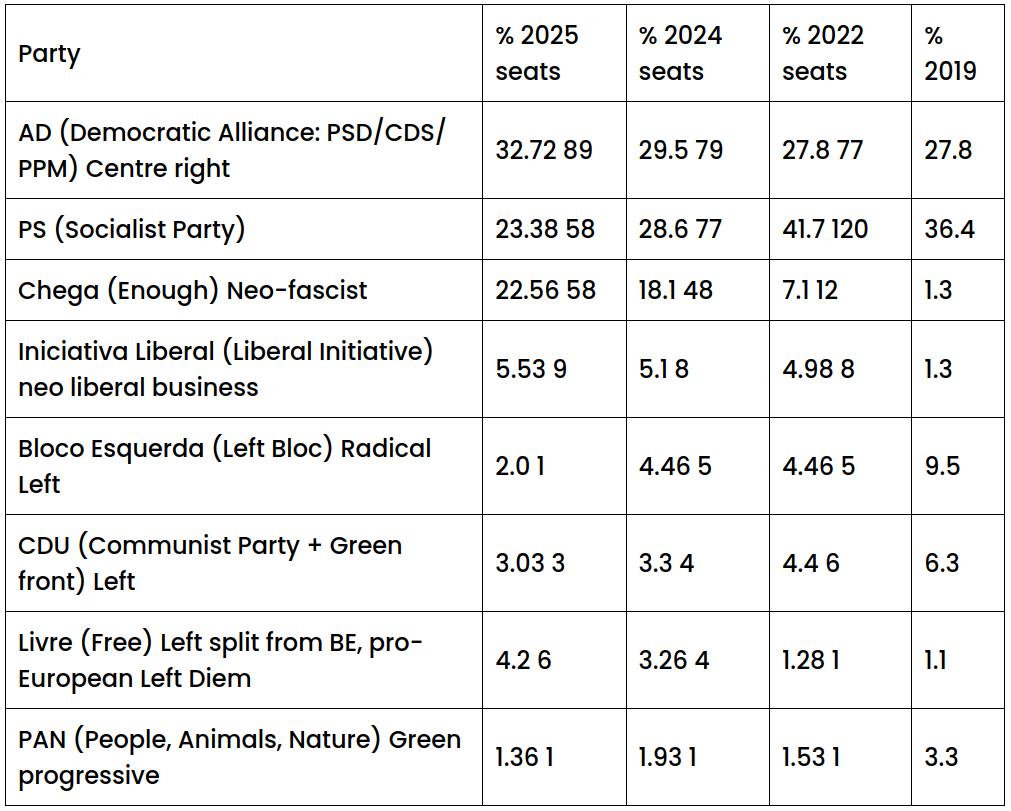 Toen een paar jaar geleden de progressieve overeenkomst tussen de PS-regering en de twee belangrijkste radicale partijen, de communisten en het Links Blok (BE), uit elkaar viel, ging de PS-leiding ervan uit dat ze met een absolute meerderheid kon winnen en regeren. Er hoefde geen overeenkomst te worden gesloten met partijen links van haar. Die strategie is mislukt, aangezien ze Chega maar nipt heeft verslagen. De steun van de PS voor financiële orthodoxie en een partnerschap met het bedrijfsleven heeft haar traditionele achterban niet enthousiast gemaakt. De terugkerende corruptieschandalen hebben haar achterban nog verder van haar vervreemd.